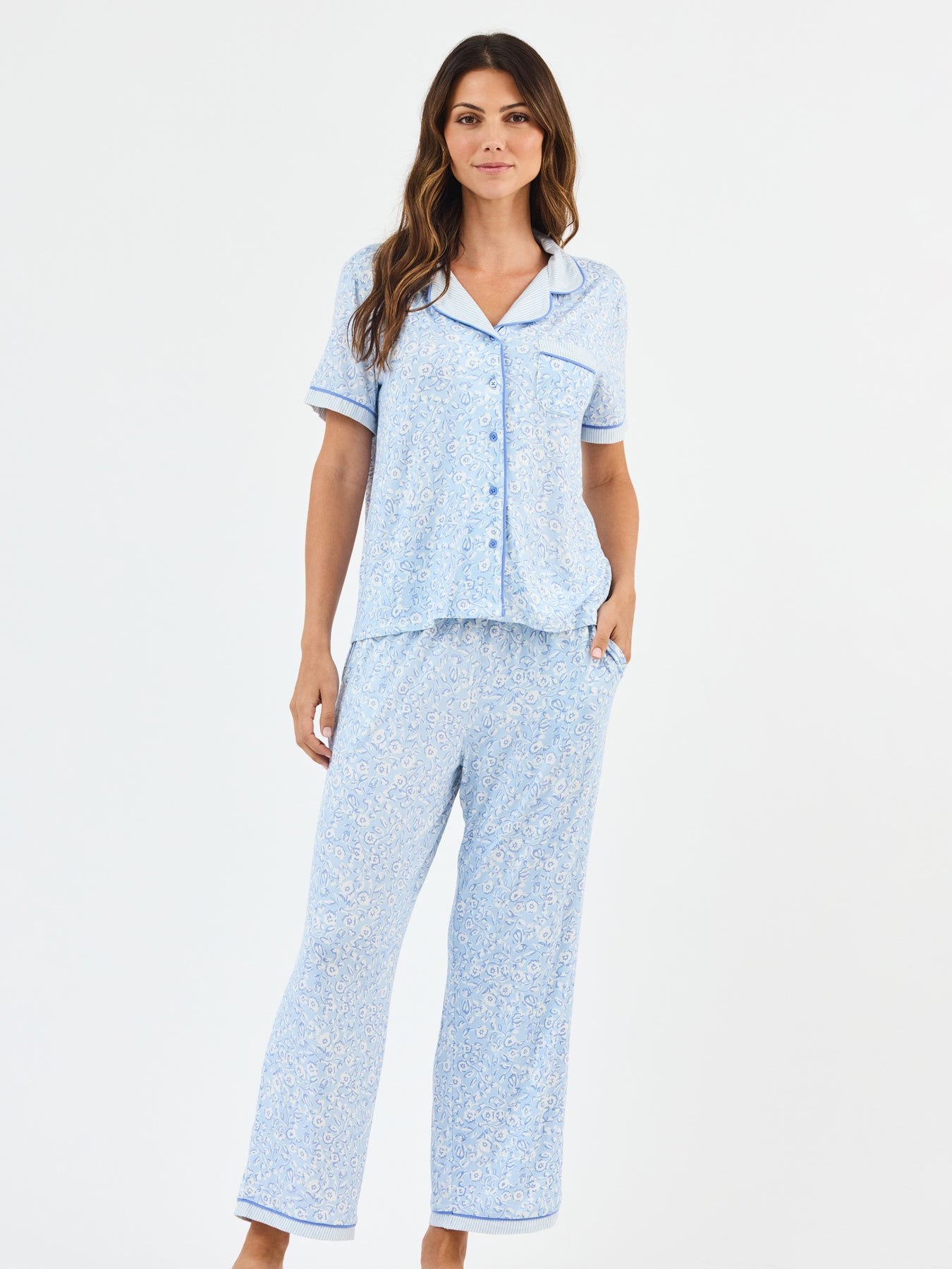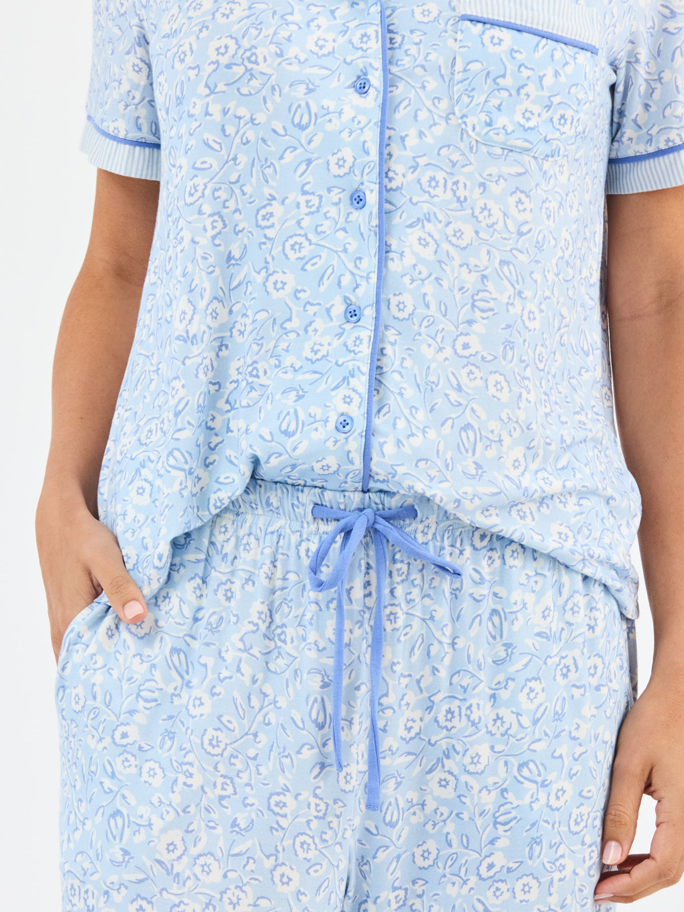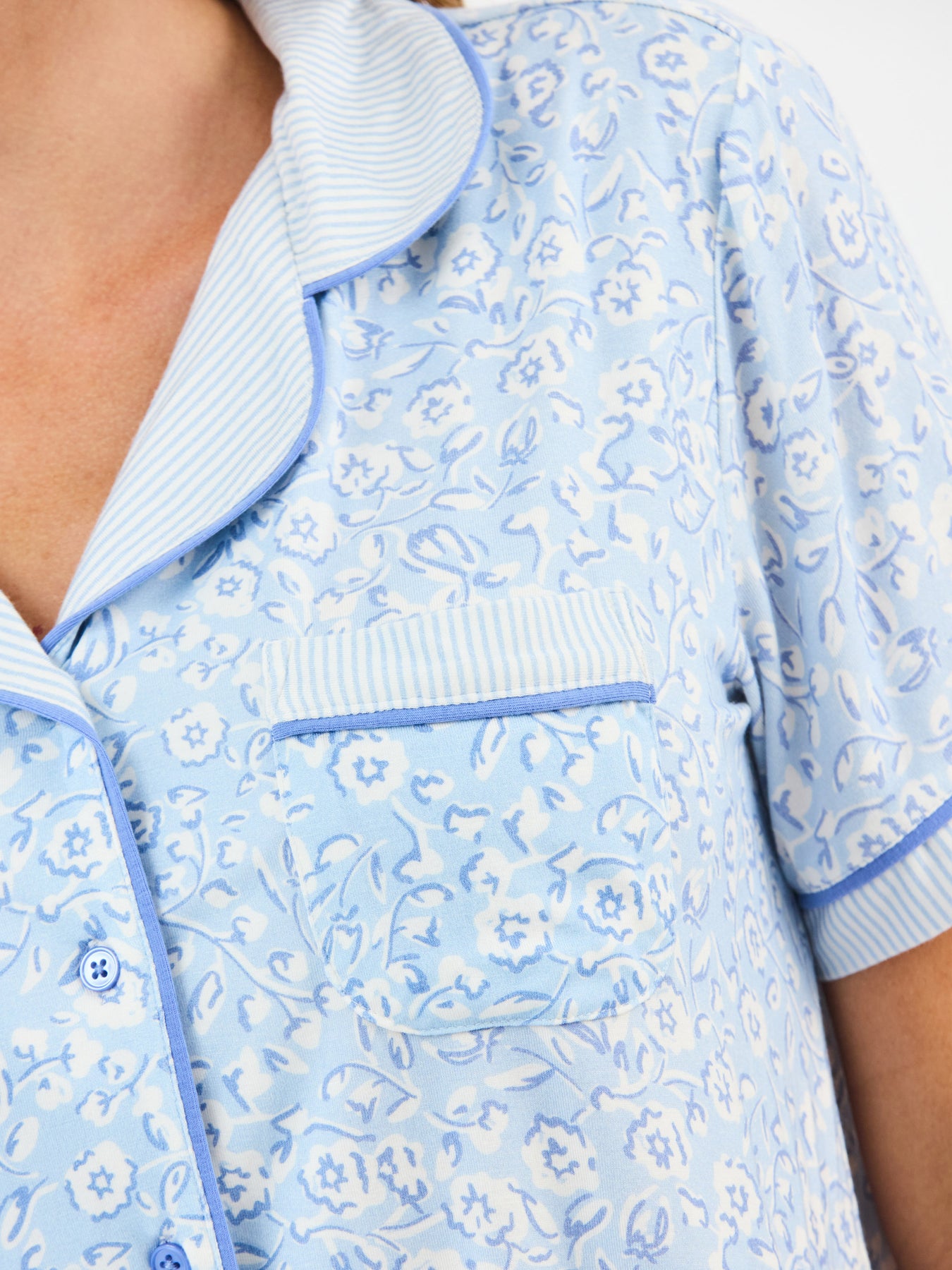 Light blue floral-patterned pajama set with white trim on a plain background