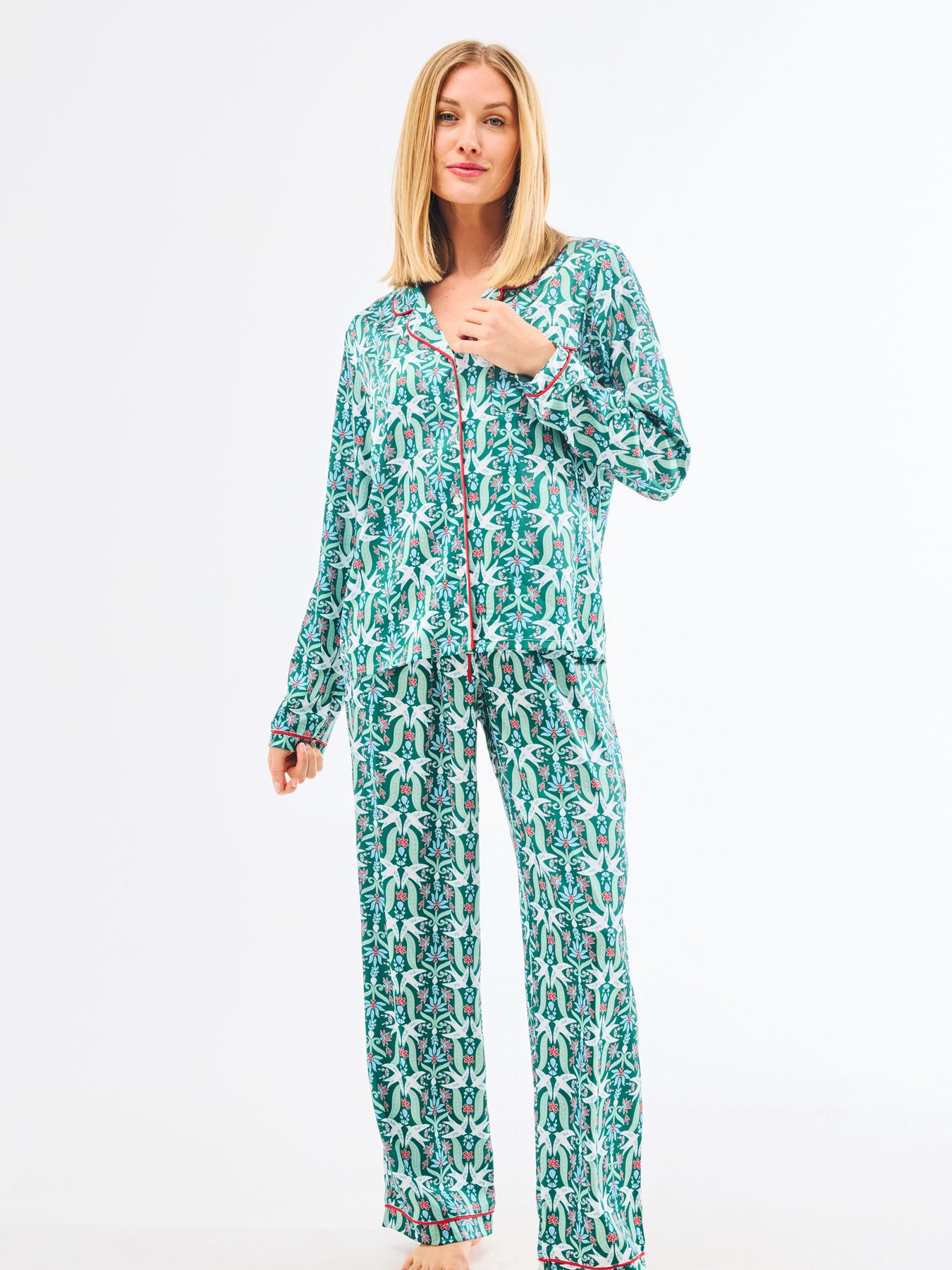 Introducing our Holiday Charlotte Satin Pajama Set, where luxury meets cozy relaxation. Perfect for sipping cocoa by the tree or enjoying Christmas morning in comfort, this pajama set brings festive elegance to every moment. Featuring a button-front top with a classic collar and straight-leg pants with an adjustable drawstring, our Charlotte Satin Pajama Set combines timeless style with all-day comfort.