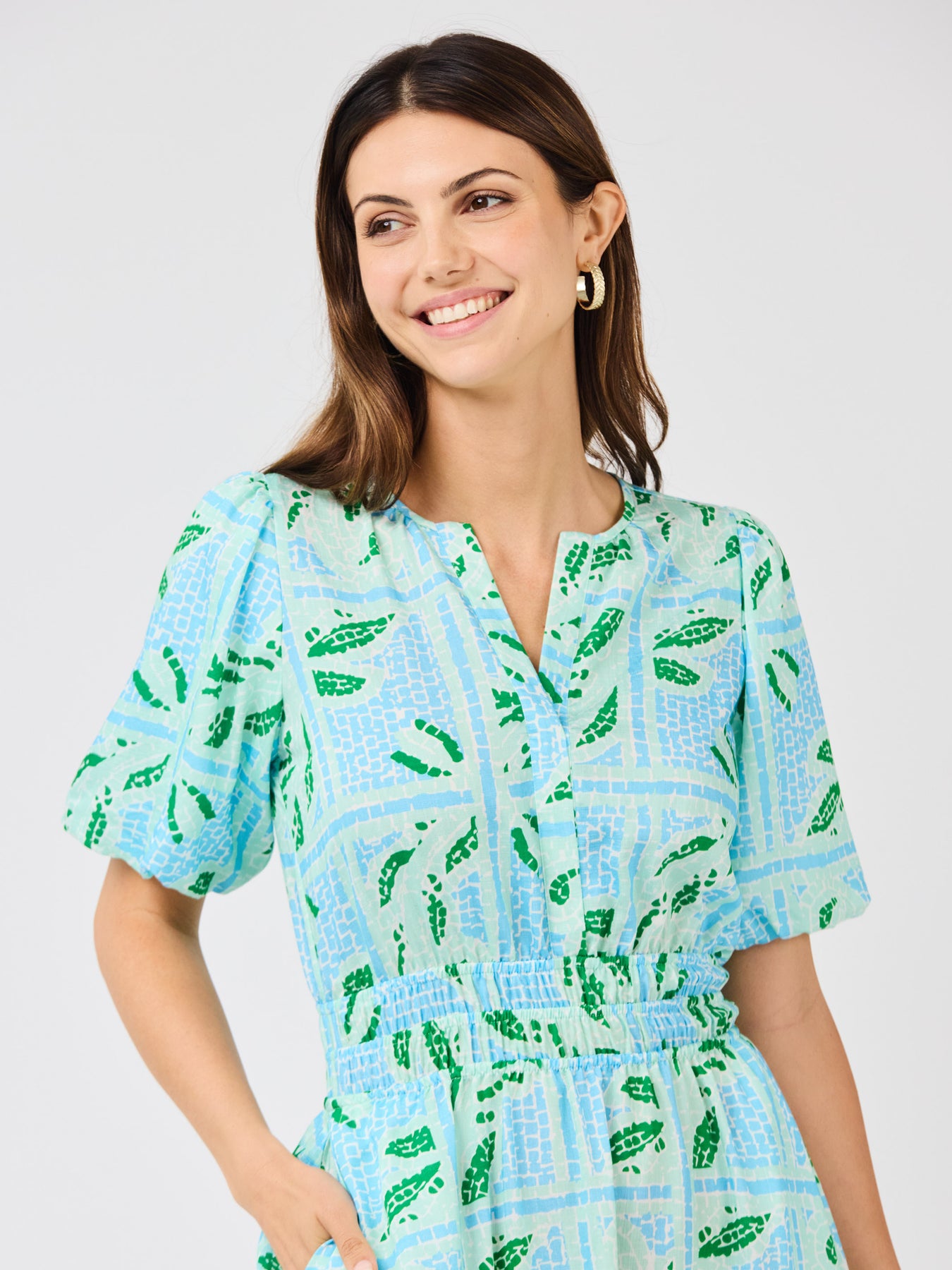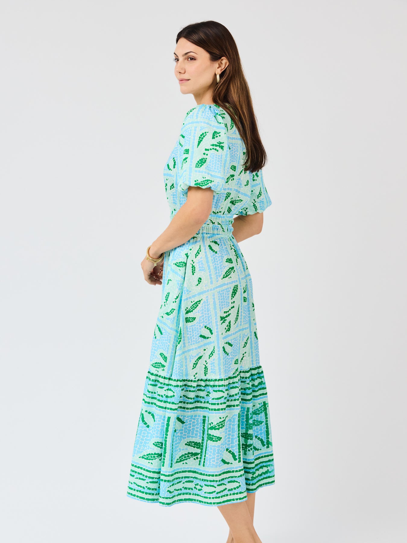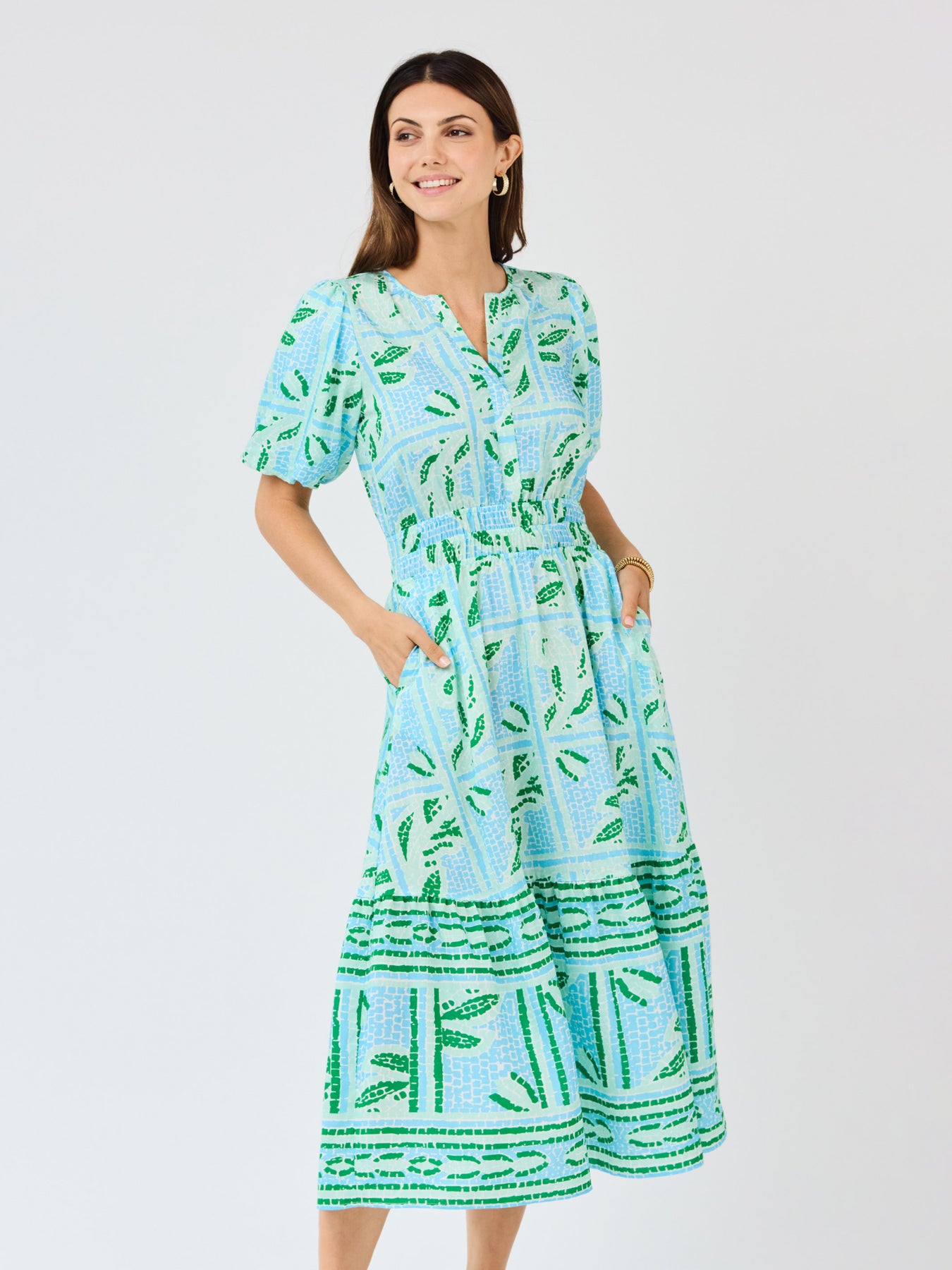The Tracey Dress is an effortless favorite with feel-good details throughout. A split V-neckline and softly puffed sleeves add a touch of charm, while the smocked waist creates a flattering and comfortable fit. Finished with a tiered hem for easy movement and pockets for everyday practicality, this dress is made for days when you want to look put-together without trying too hard.