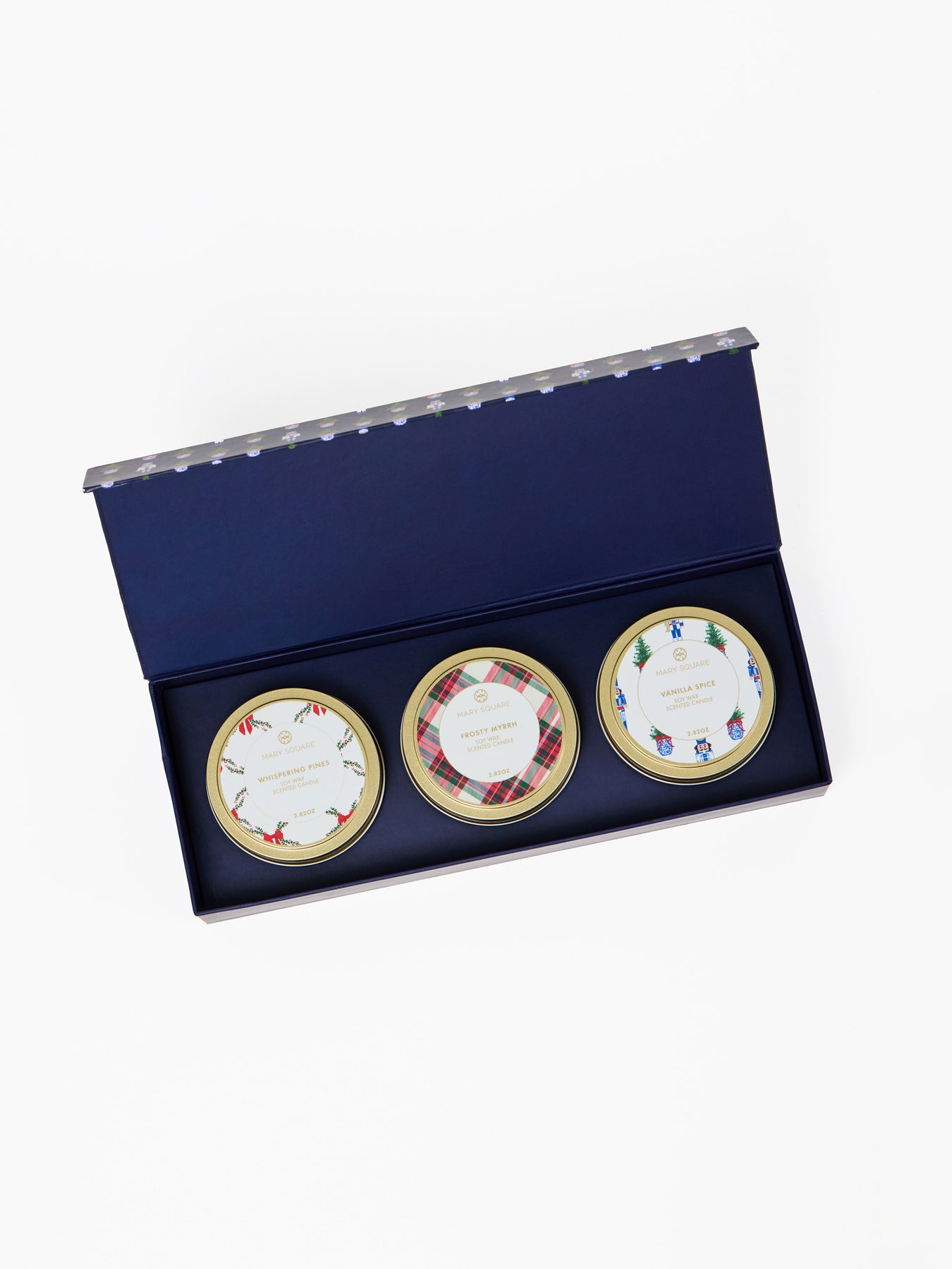 Introducing our Boxed Candle Trio Set - a festive collection of three gold tin candles, each wrapped in a charming holiday print and filled with one of our signature seasonal scents. Enjoy Vanilla Spice, a warm blend of creamy vanilla latte with a hint of spice; Frosty Myrrh, a rich mix of balsamic notes, vanilla, and tonka bean; and Whispering Pines, a cozy combination of smoky wood, cedar, pine, clove leaves, orange, and raspberry. Perfectly packaged and ready to gift, this trio brings the spirit of the season to any space.