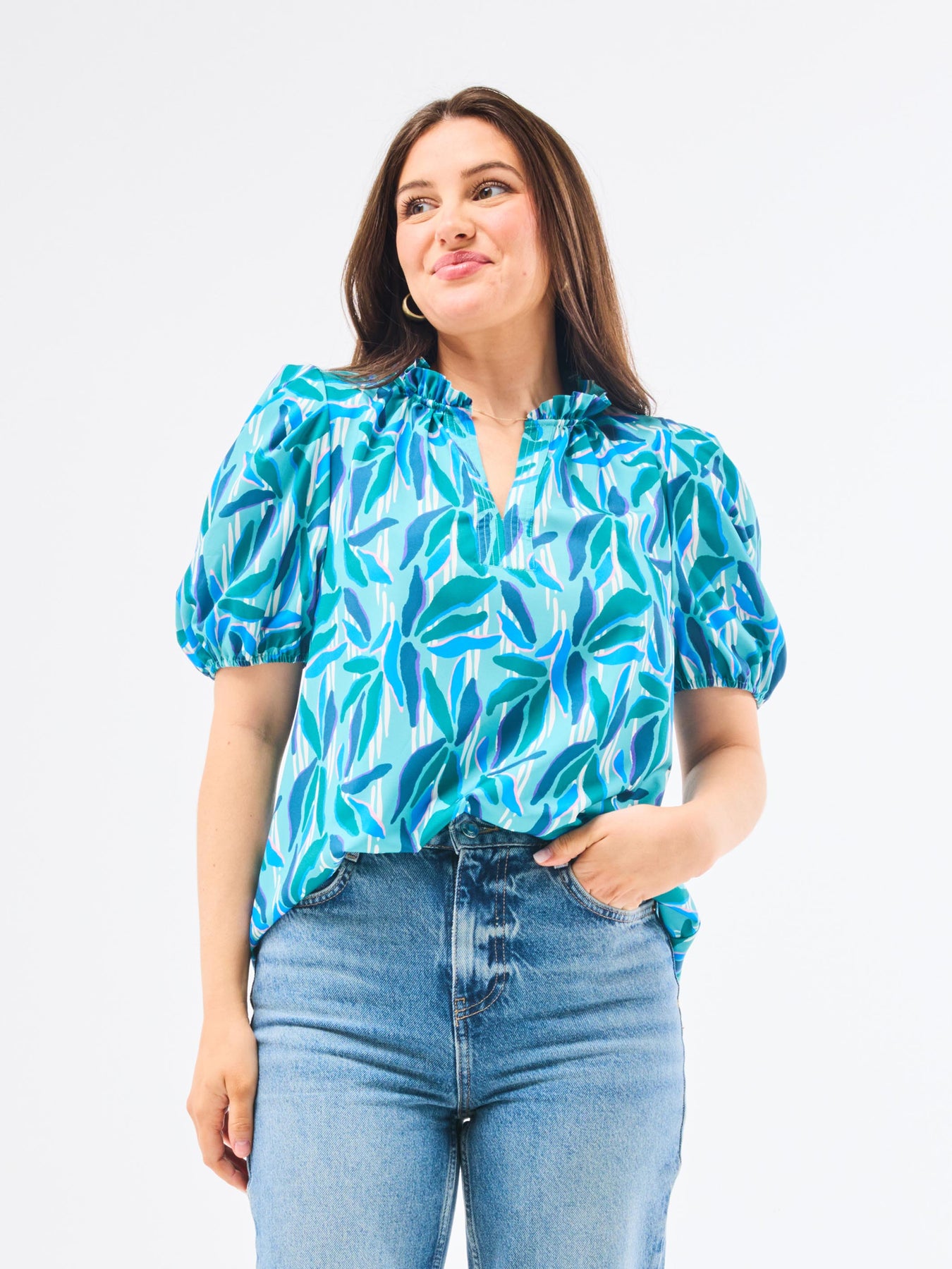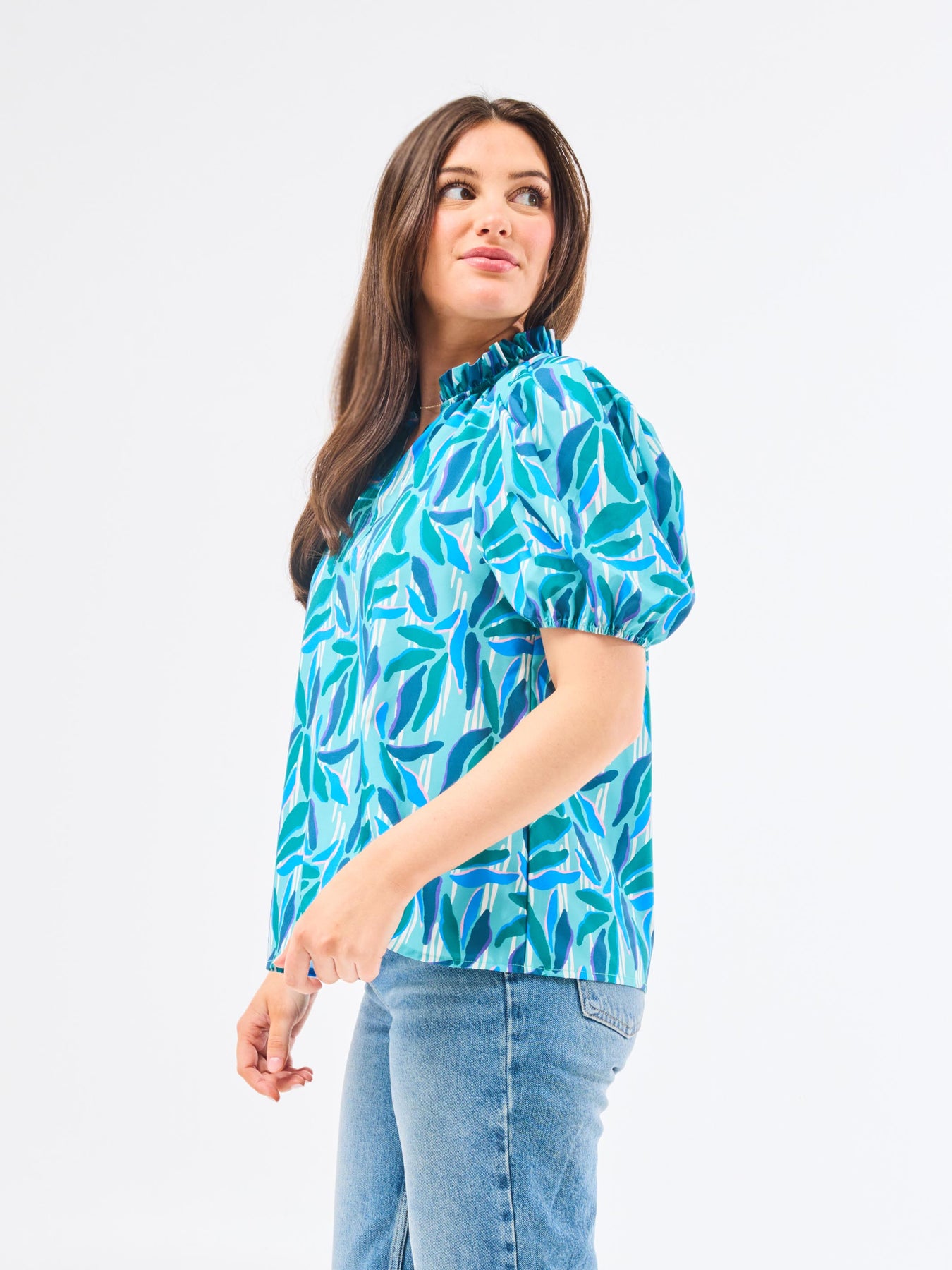 Elevate your everyday style with the Lainey Top. This top features short puff sleeves with elastic for a comfortable yet chic look, while the ruffle split neckline adds a romantic, flowy touch. The stitched placket enhances the top's structured design, giving it a refined and modern feel.