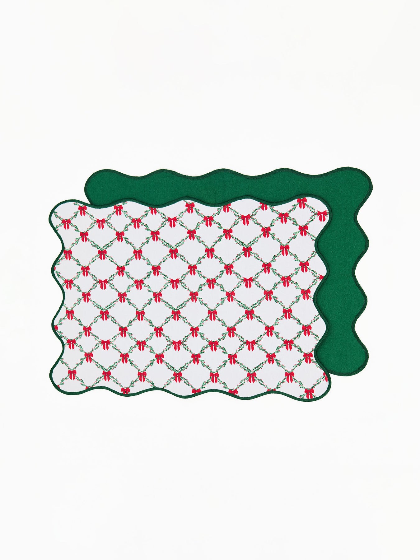 Set a festive table with our Reversible Holiday Trellis Scallop Edge Placemats. Featuring our classic holiday trellis design on one side and a coordinating solid on the other, these placemats offer versatile style for any seasonal occasion. Finished with a charming scalloped edge, they add a touch of elegance and holiday cheer to your dining experience.