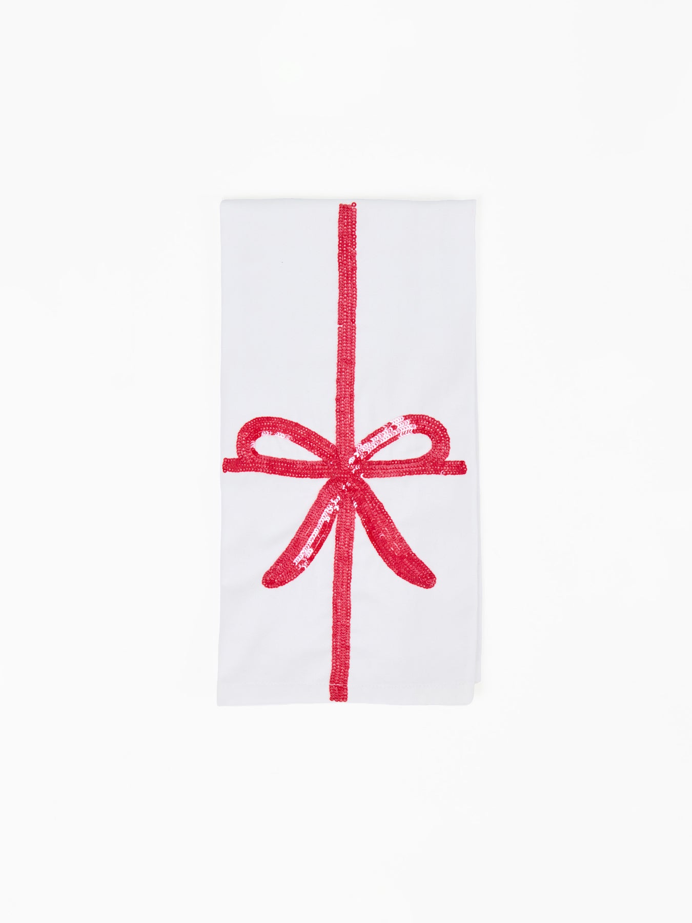 Add a sparkling touch to your holiday kitchen with our Sequin Red Bow Tea Towel. Featuring a bold red bow accented with shimmering sequins, this festive towel brings eye-catching charm and seasonal sparkle to your decor. Perfect for holiday baking, gifting, or brightening up your space all season long.