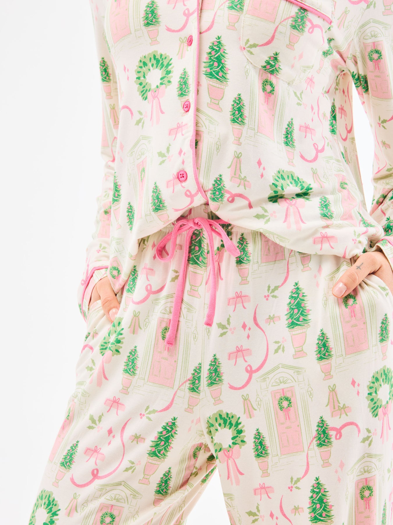 Introducing our Holiday Charlotte Pajama Set, where comfort meets festive charm. Perfect for sipping cocoa by the tree or enjoying Christmas morning in cozy style, this pajama set brings holiday cheer to every moment. Featuring a long-sleeve button-front top with a classic collar and straight-leg pants with an adjustable drawstring, our Charlotte Pajama Set combines classic holiday style with all-day comfort.